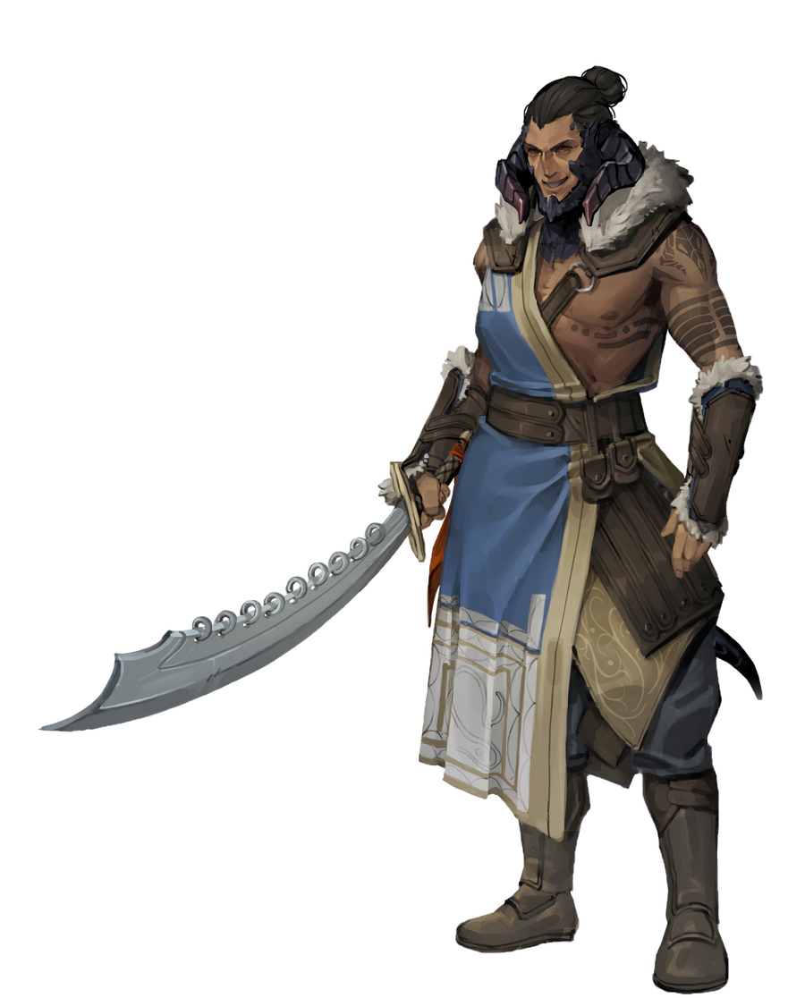 Wandering Heart - A custom for many Dotharl in welcoming new life is often a roaring celebration, one fit to shake the very foundations of the Dawn Throne itself. But as a child of two tribes, Ghazan was not brought into the world by the fiery warmth of a ger; to the rhythmic rumbling of drums; to howling songs and cheer that could have far outlasted the long night of his birth. Given a very different name by his late Dataqi mother, his was said to be along a dark and hardy mountain trail, to the sound of steady footfalls against well trodden earth, and to gentle hums from a caravan that stretched onwards to the horizon. Fate would eventually leave him with only stories and distant memories of his mother and itinerant cousins, and he hopes to one day rediscover that lost heritage in a sore yet honest effort to make peace, both with the Dataq and a life that never was.Warrior Soul - Brought to his Dotharli father by his mother's tribe mere months after his birth, it was among braver kin he was raised to carry the legacy of his ancestors, and given the storied name of Ghazan. While 'destined' to a life of war and death like many Dotharl, Ghazan's soul is said to have had a particular history in fighting battles far beyond those of the Steppe, and they were - and perhaps, he still is - a revolutionary who would often champion many an uncommon cause. While a complicated legacy to live up to, Ghazan's current lack of meaningful direction is usually made up for, first by his odd Dataqi habit of simply wandering into trouble, and second by his Dotharli instincts and training to fight his way out of most of them.Better Devils - While not uncommon for modern Xaela to venture beyond their ancestral homelands, it was along the One River that blah blah blah